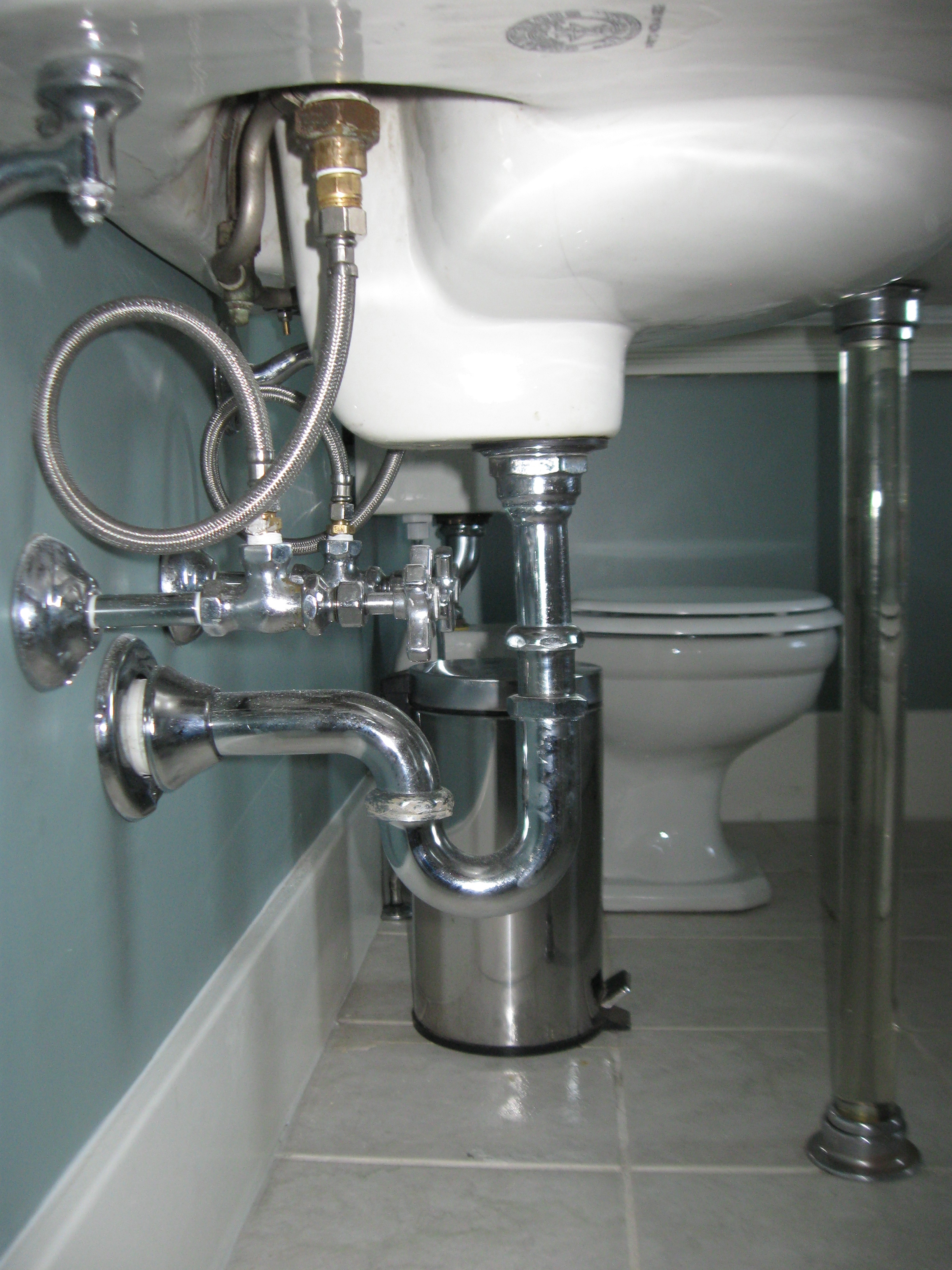 The brackets are original, as are the 2″ glass legs. The upper and lower pucks on the legs are adjustable to about 3/4″ apiece. The shut-off valves are Standard. The cup holder’s origin is unknown, but lets pretend it’s a Mott. We had another set of glass legs, which some @ss%^& stole out of Steve’s barn during the Great Recession. They also stole the pucks. Probably for scrap.