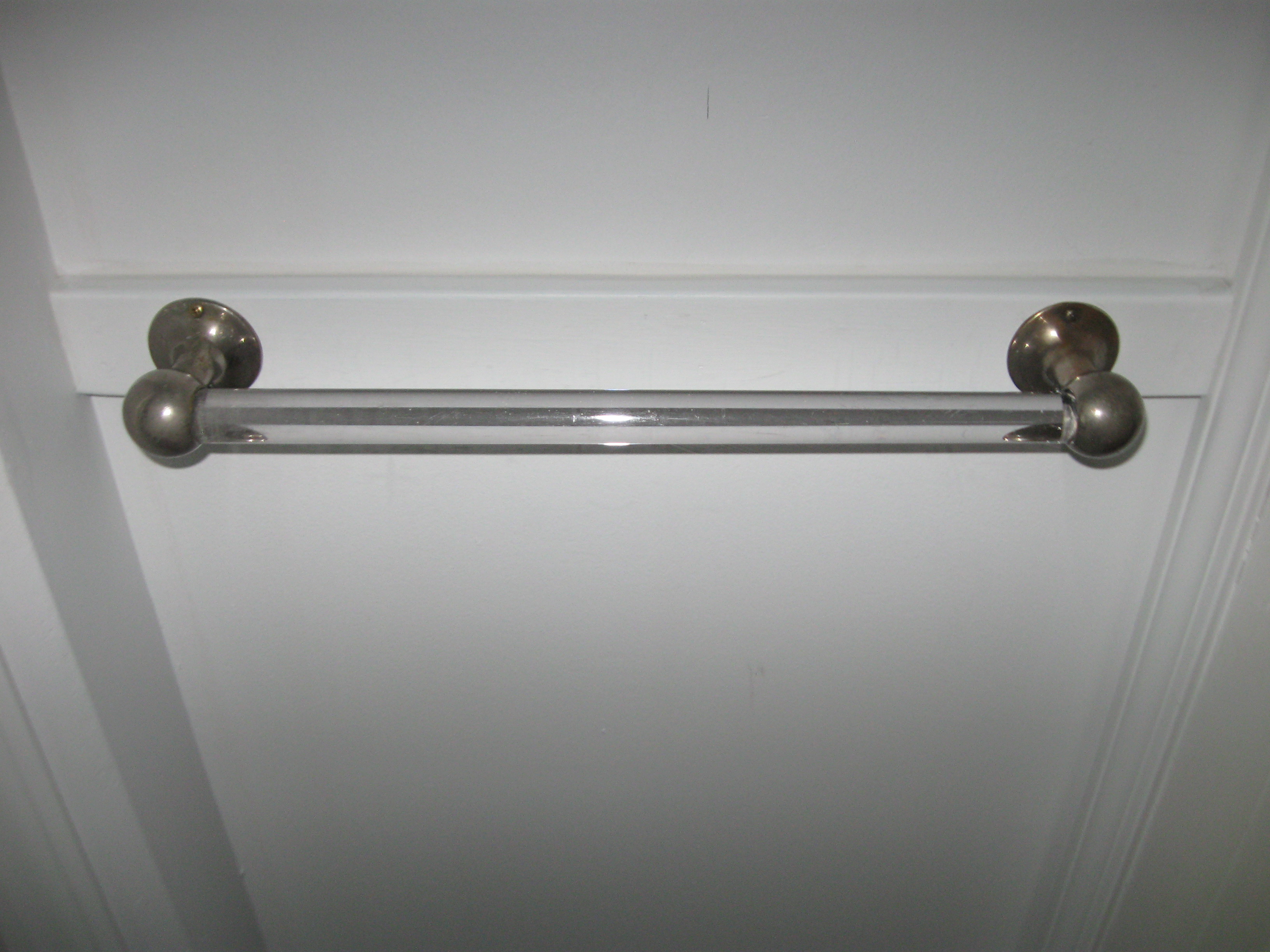 The glass towel bar came from the Divine Lorrain Hotel in Philadelphia. Manufacturer unknown
