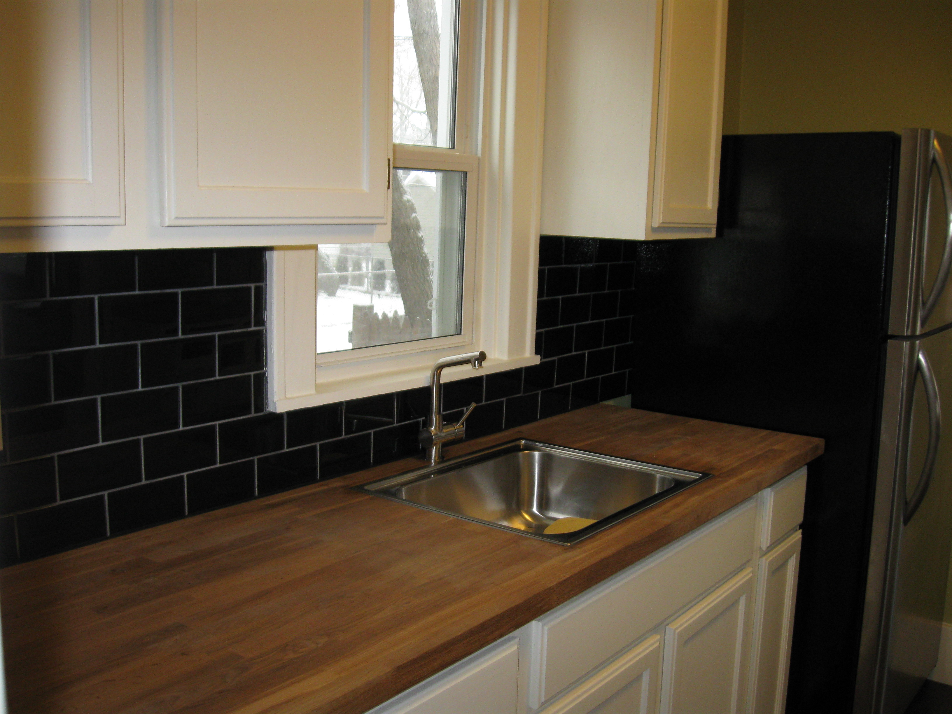 The kitchen was home-depo’d to where nothing fit anywhere. We removed two layers of subfloor in the kitchen and a layer of stick tile under that. Voila, original oak flooring in the kitchen, which we stained to match the rest of the downstairs and coated 4 times. We then painted and re-used the oddly-sized home depot cabinets in the re-configured kitchen (we moved the sink out of the corner to the window), added a black subway glass tile backsplash, and a small utility counter where the 1930s Kelvinator used to go.